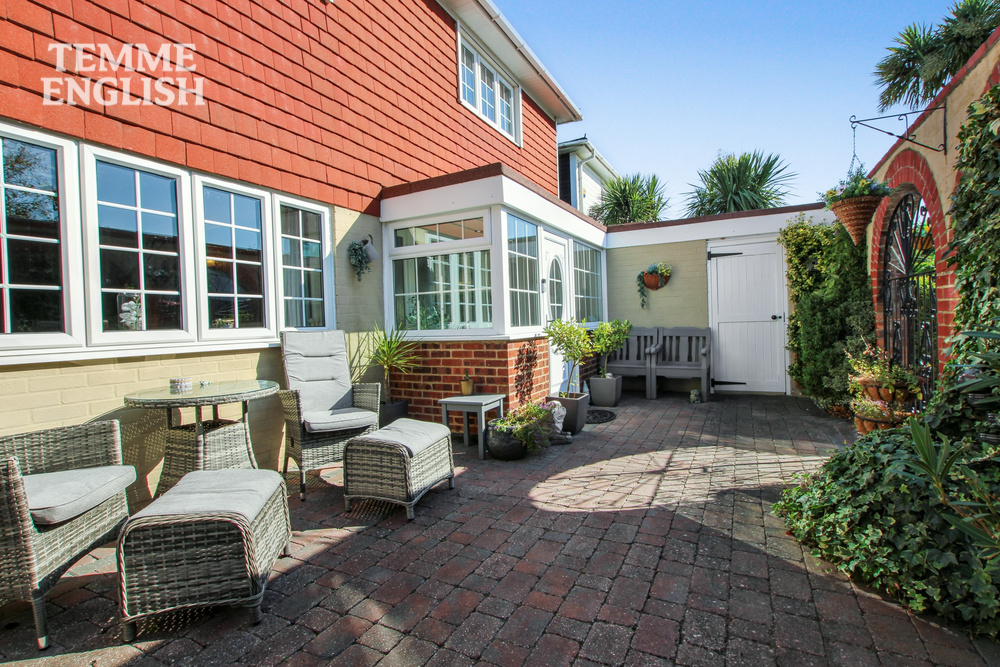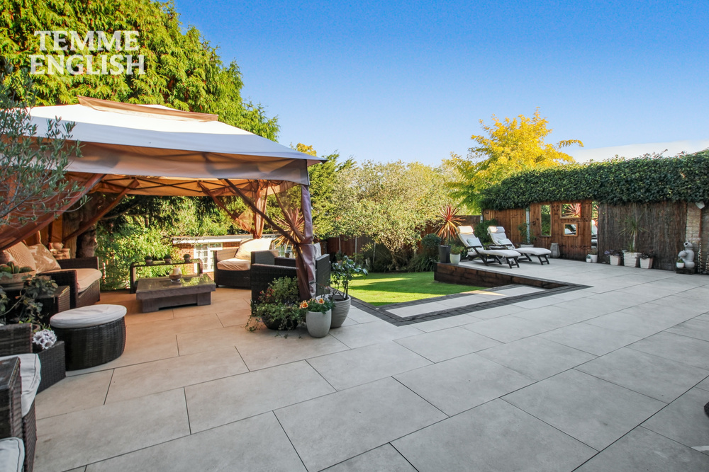 Externally, the property boasts excellent kerb appeal, being introduced by a generous paved driveway, which provides ample off street parking for multiple vehicles and access to a garage with an electric roller door. The driveway leads into a charming courtyard garden, creating a welcoming approach before entering the house. To the rear, the landscaped garden has been thoughtfully designed to include an elegant porecelain patio area, a spacious lawn bordered with well tended planting, and a versatile outbuilding. Both the garage and the outbuilding present exciting potential for conversion, whether as a garden bar, additional living accommodation, or guest quarters, subject to the necessary planning permissions.