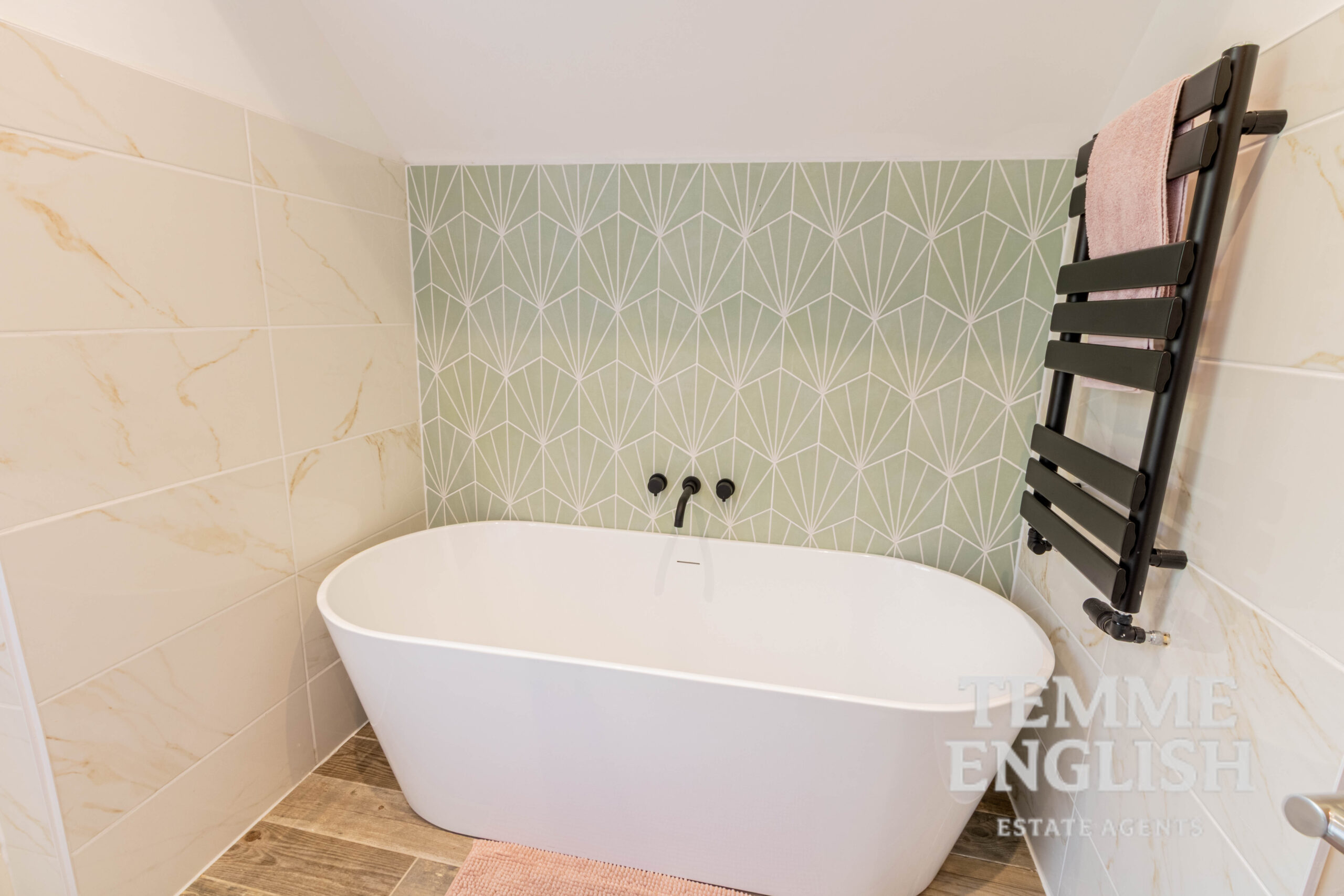 Upstairs, the property offers three generous bedrooms, each thoughtfully decorated and ready to move into. The luxurious family bathroom is a real highlight, featuring a separate shower enclosure and an elegant freestanding bath, creating a spa-like feel.
