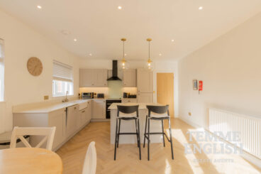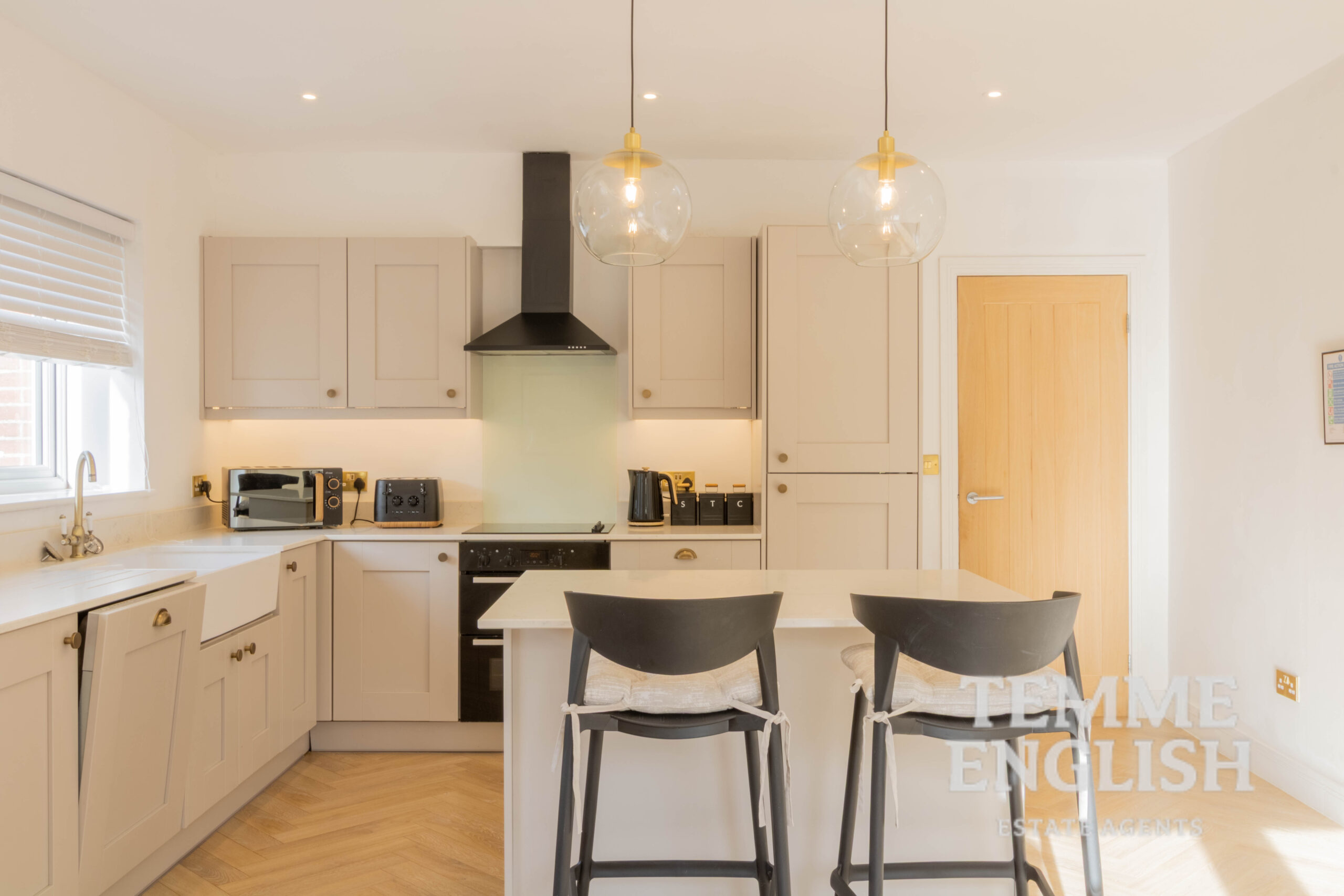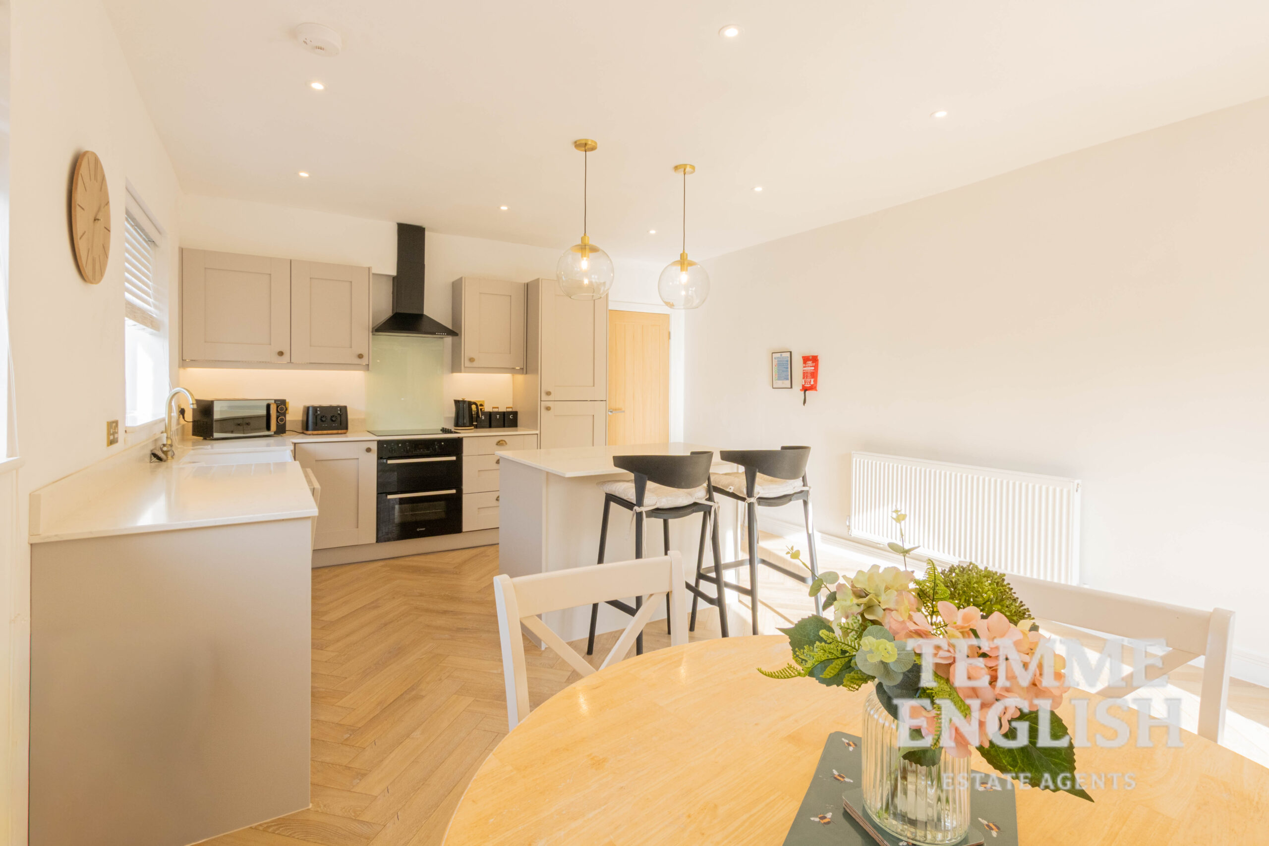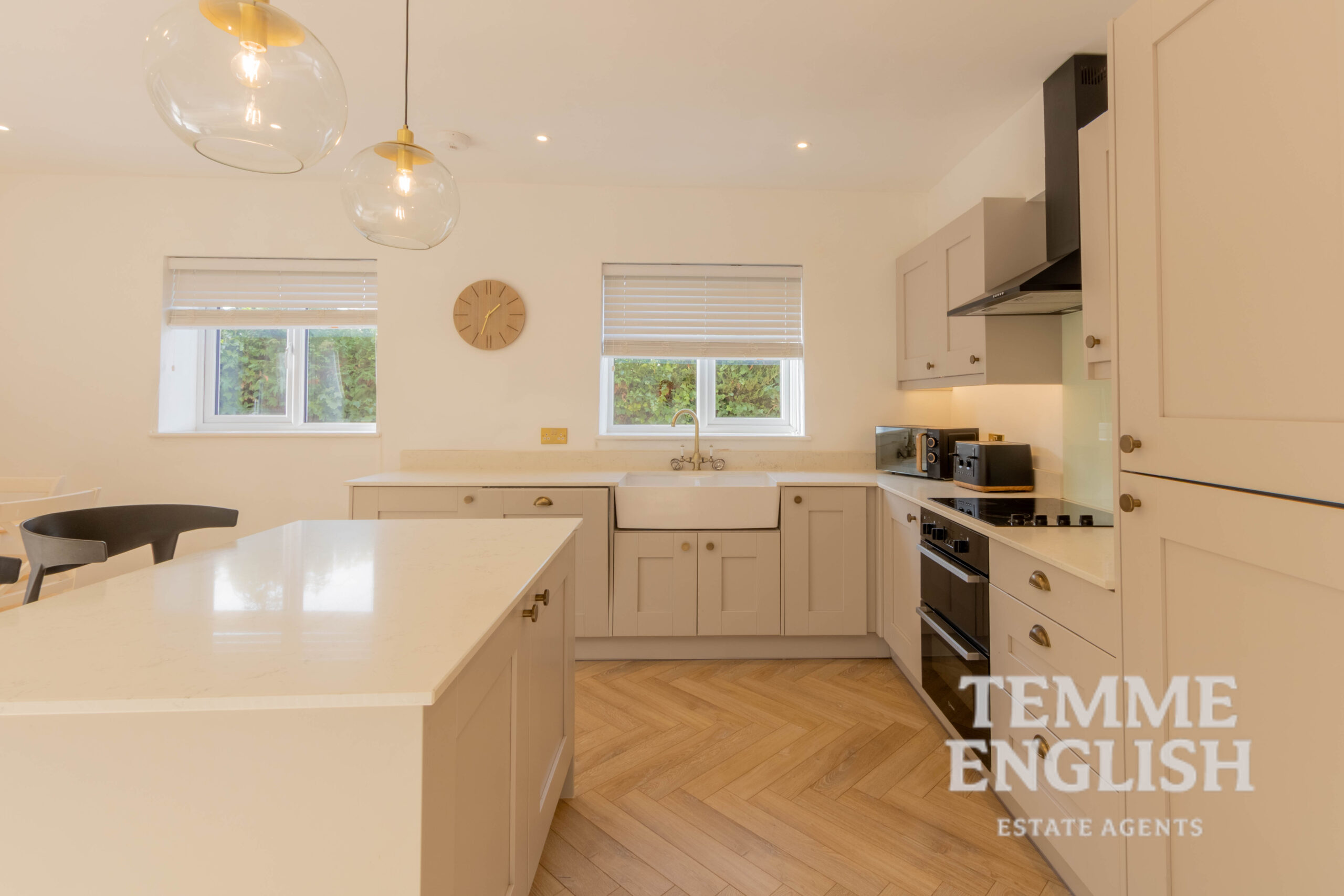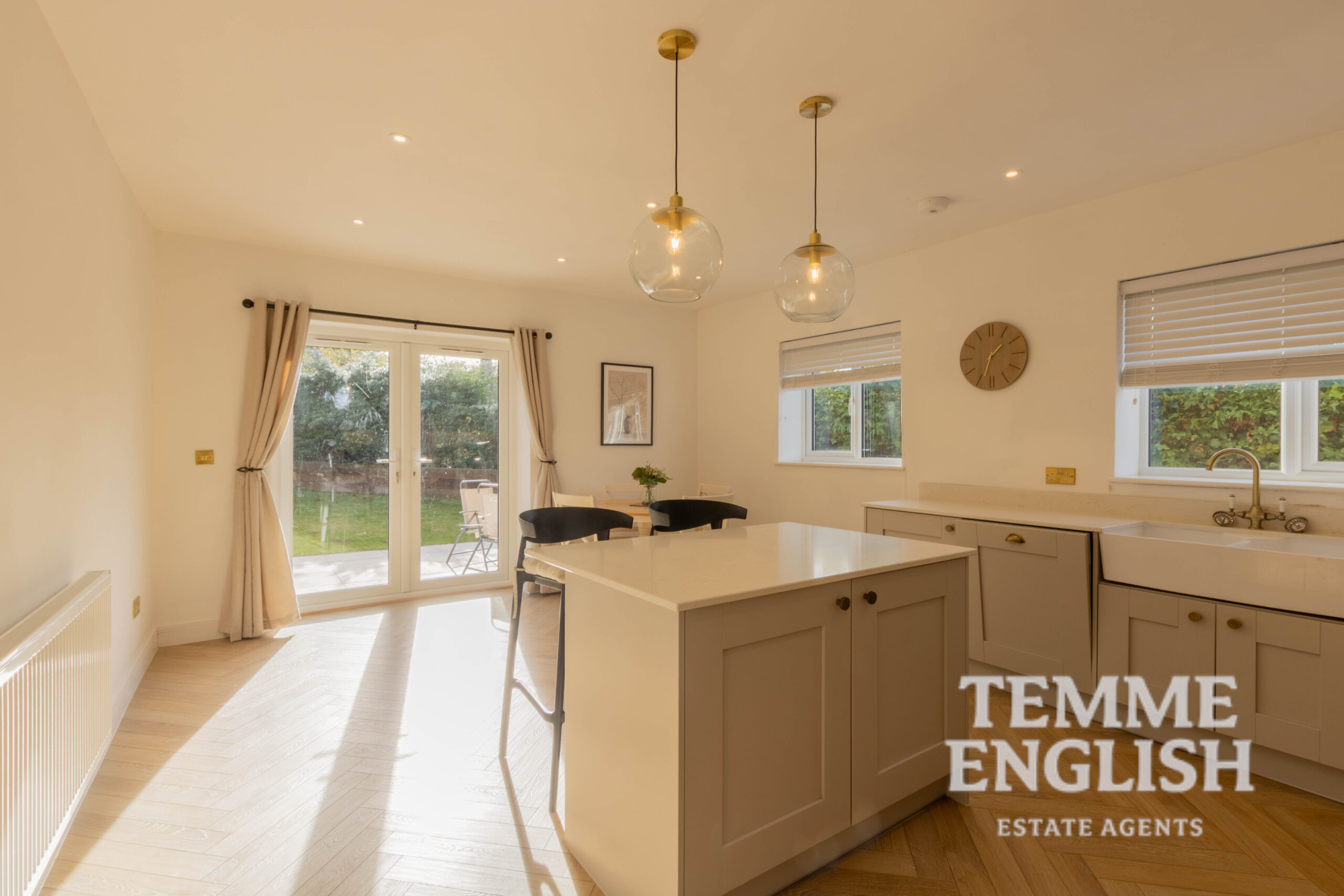 At the heart of the home lies the impressive kitchen/diner, beautifully designed with a butler sink, central island, and high-quality worktops complemented by a range of fitted cupboards and drawers. The kitchen also features fully integrated appliances and enjoys a seamless flow to the rear garden, creating a light and inviting space perfect for everyday family life or entertaining. There is also ample space to dine here, while the spacious lounge/diner provides an additional option for both relaxing and dining with ease.
