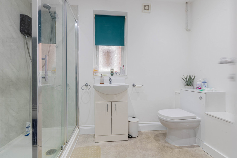 Upstairs, the first floor offers three well-proportioned bedrooms, each freshly decorated with neutral tones, creating a blank canvas for the new owner. The family bathroom has also been upgraded and now features a stylish suite comprising a corner shower cubicle, low-level WC, and wash hand basin, all finished to a high standard.