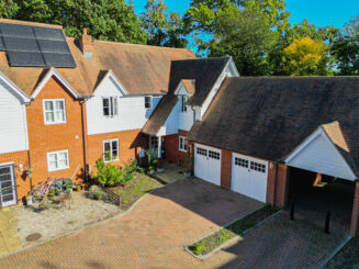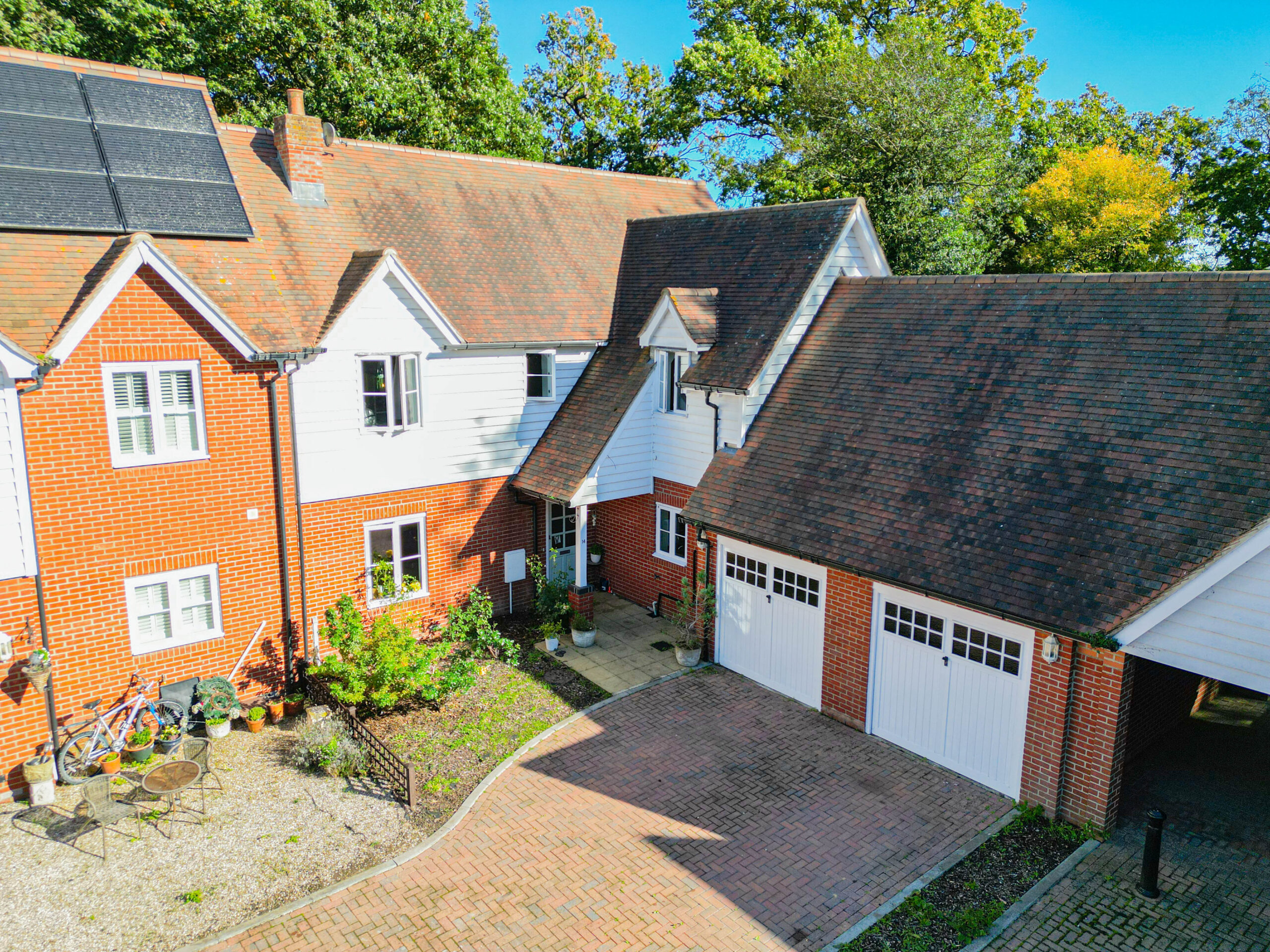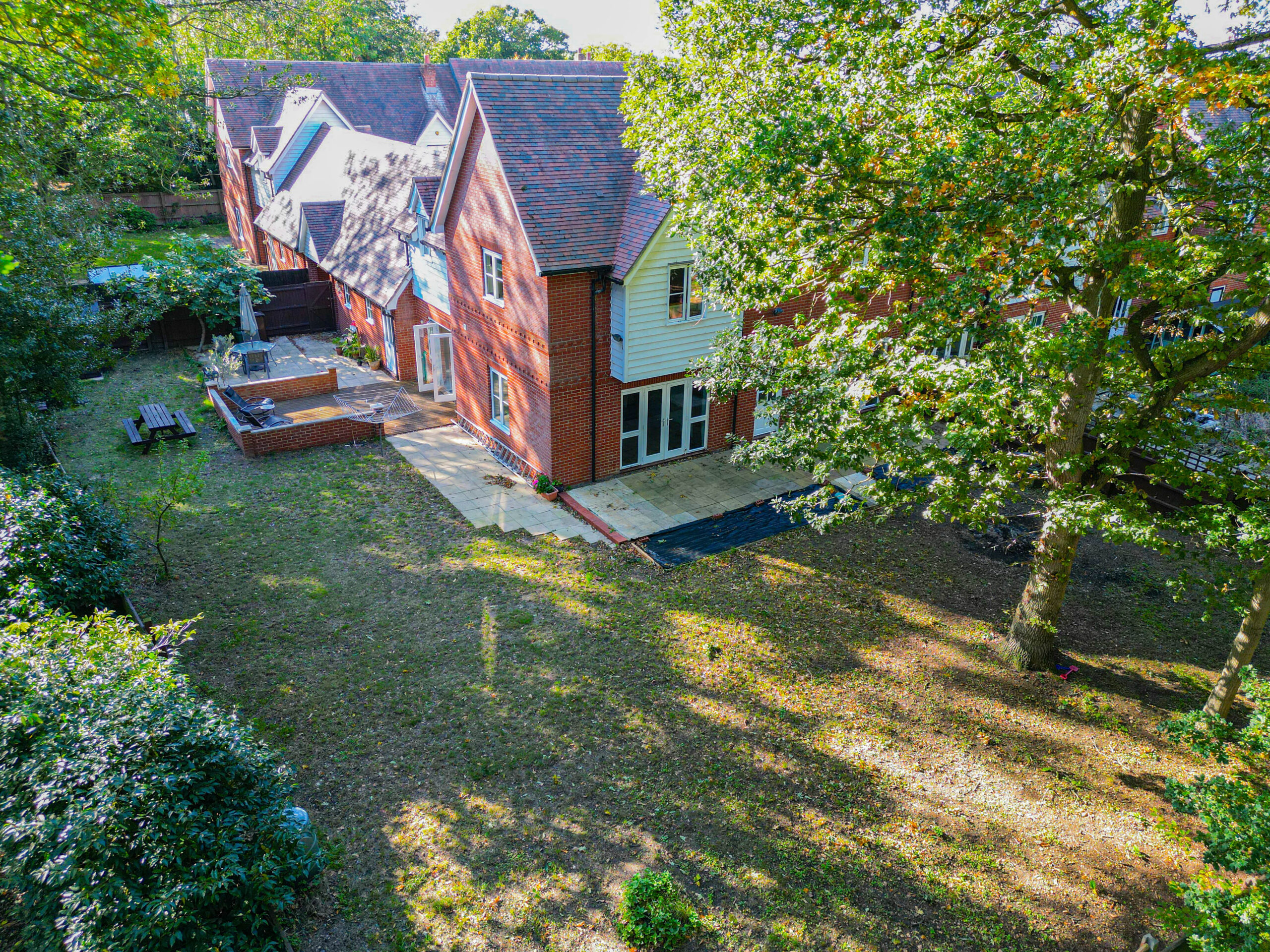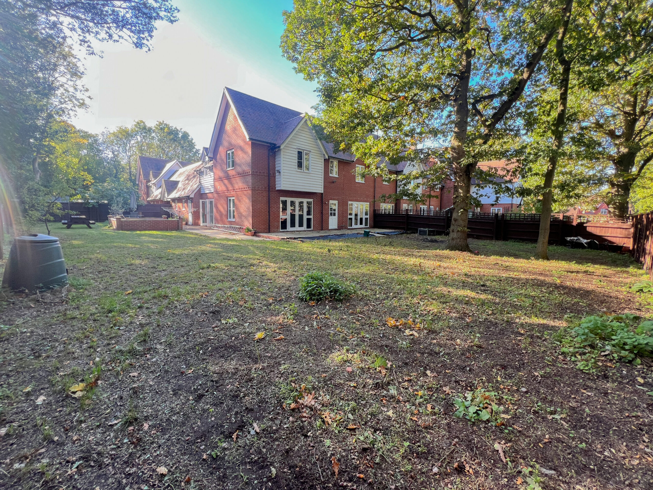 This home is nestled within an attractive and thoughtfully designed residential development, and it occupies a generous L-shaped plot that mirrors the footprint of the house itself. The garden features multiple patio seating areas that invite outdoor living and relaxation. One of the most striking features of the outdoor space is its serene backdrop—mature woodland that not only offers privacy but is also a haven for local birdlife, providing a tranquil and natural setting throughout the seasons.