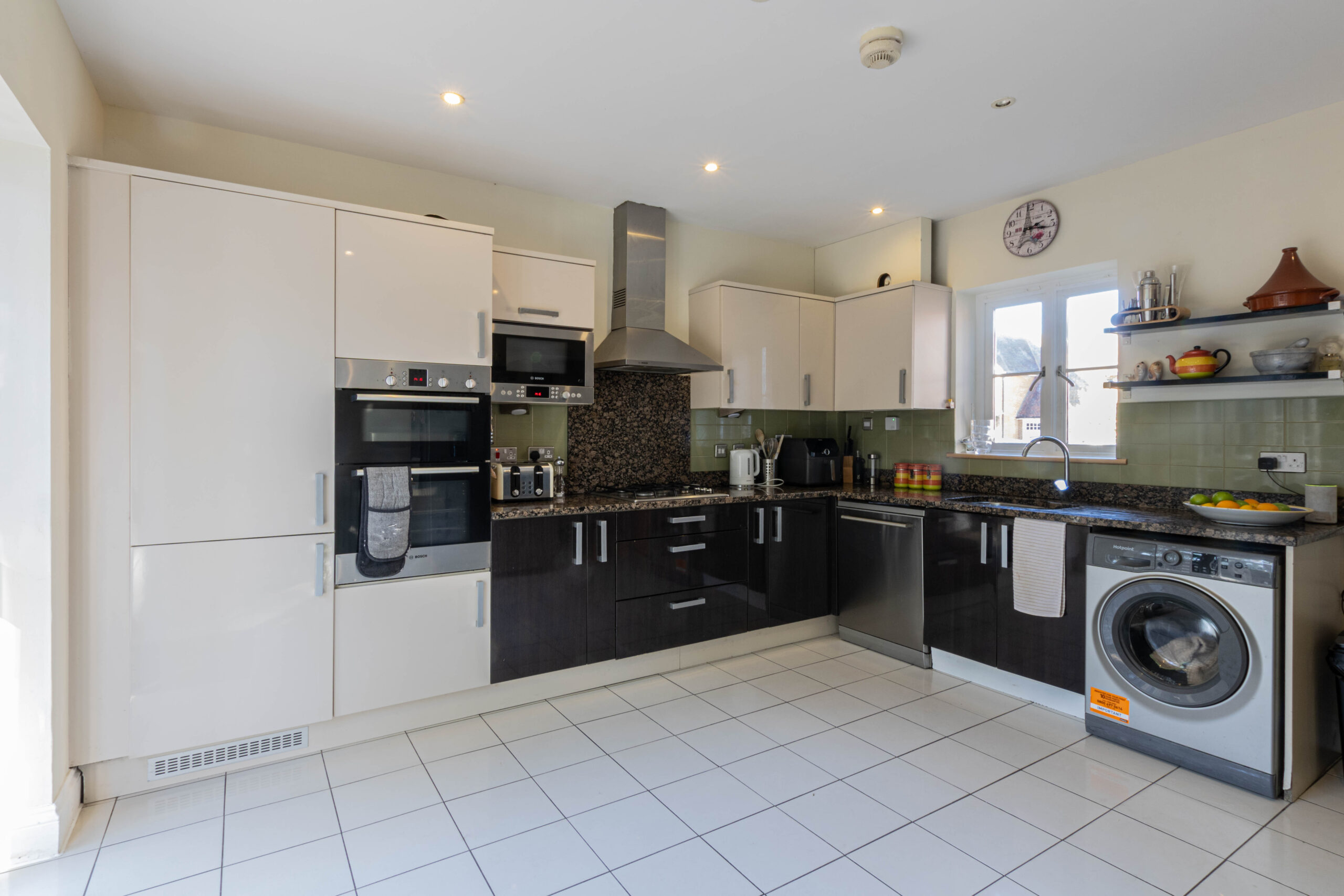 The kitchen/breakfast room is well-appointed with a stylish range of contemporary units with fitted granite work tops over offering ample cooking space. It comes fully equipped with integrated double oven and built-in microwave, a stainless steel extractor hood with hob under, and space for washing machine, a dishwasher, and a fridge/freezer—providing a practical and modern space for everyday cooking and dining. All appliances are fully Bosch.