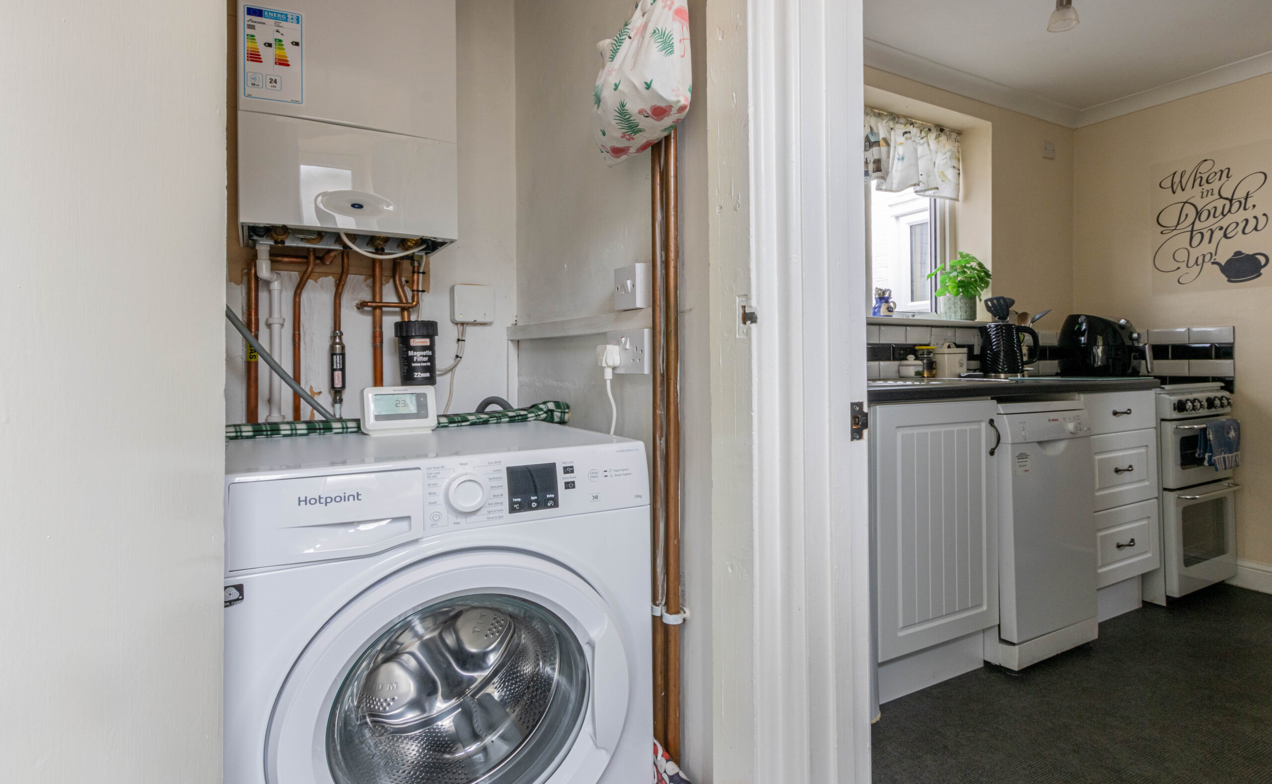 The modern kitchen is well-appointed with a range of wall and base units topped with stylish surfaces, offering ample storage and workspace. It includes an inset sink and drainer, space for a freestanding cooker, under-counter fridge and dishwasher, and a utility cupboard housing the wall-mounted boiler with space and plumbing for a washing machine. This space is designed for both functionality and style.