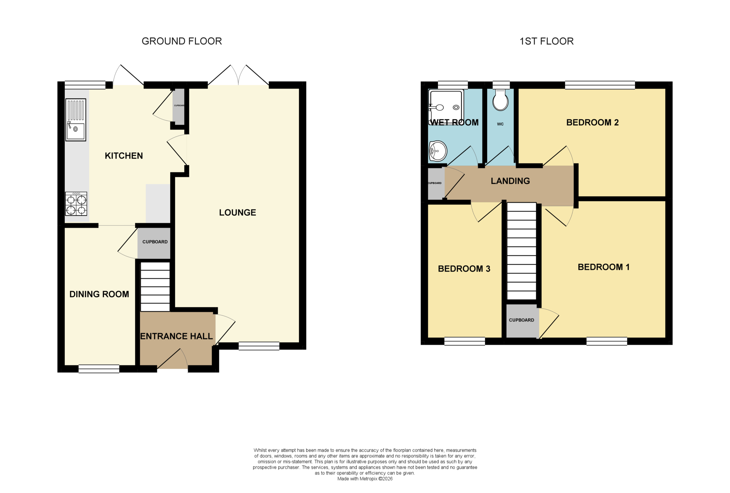 Upstairs, the property benefits from three well-proportioned bedrooms. There is currently a wet room and a separate WC, offering scope to be combined into a larger family bathroom, subject to the necessary works.