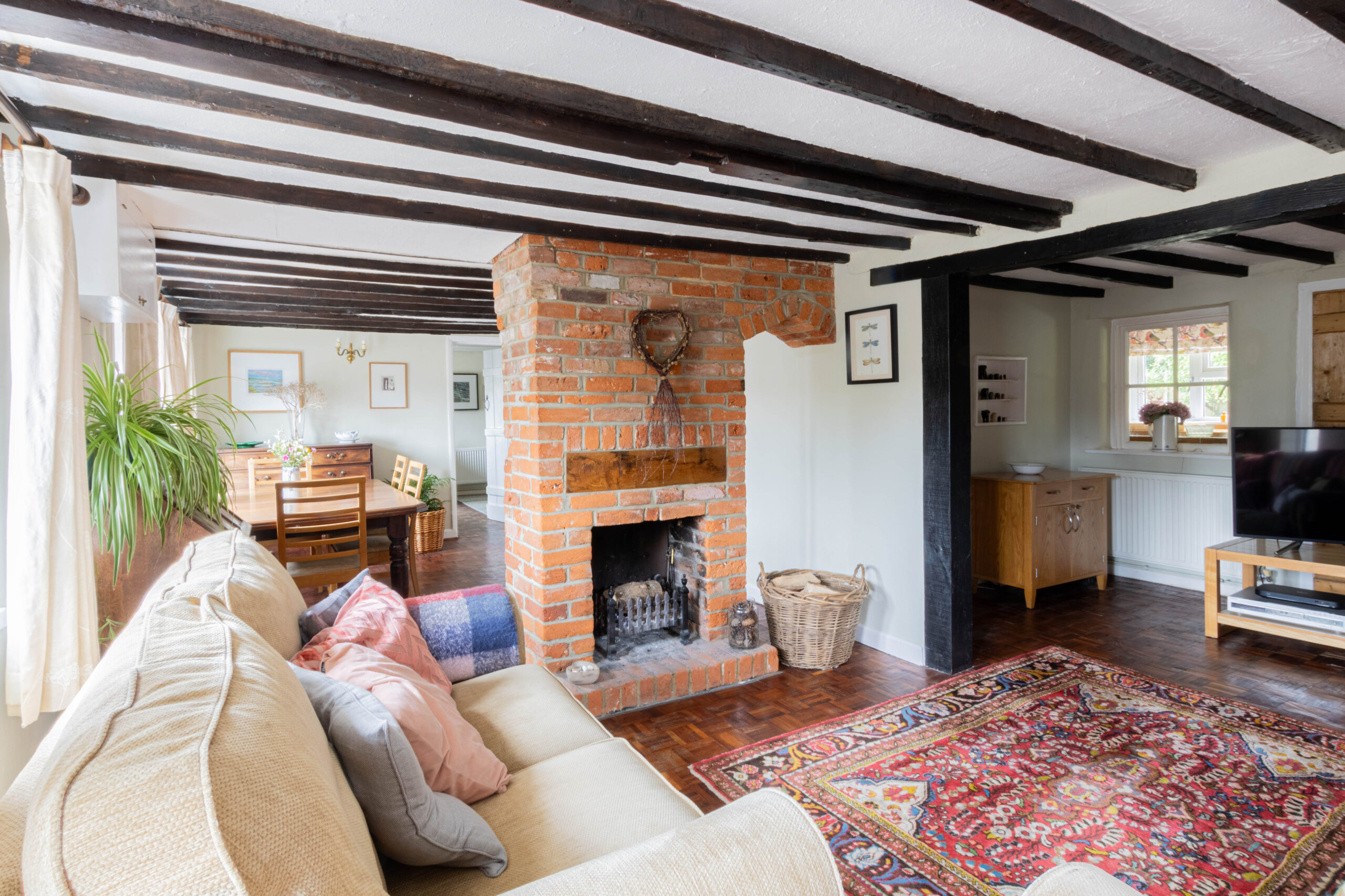 The heart of the home is an expansive double reception room, where a striking red brick fireplace subtly divides the sitting and dining areas. Period features such as exposed studwork add to the character, while large arched windows at the front of the property flood the space with natural light.