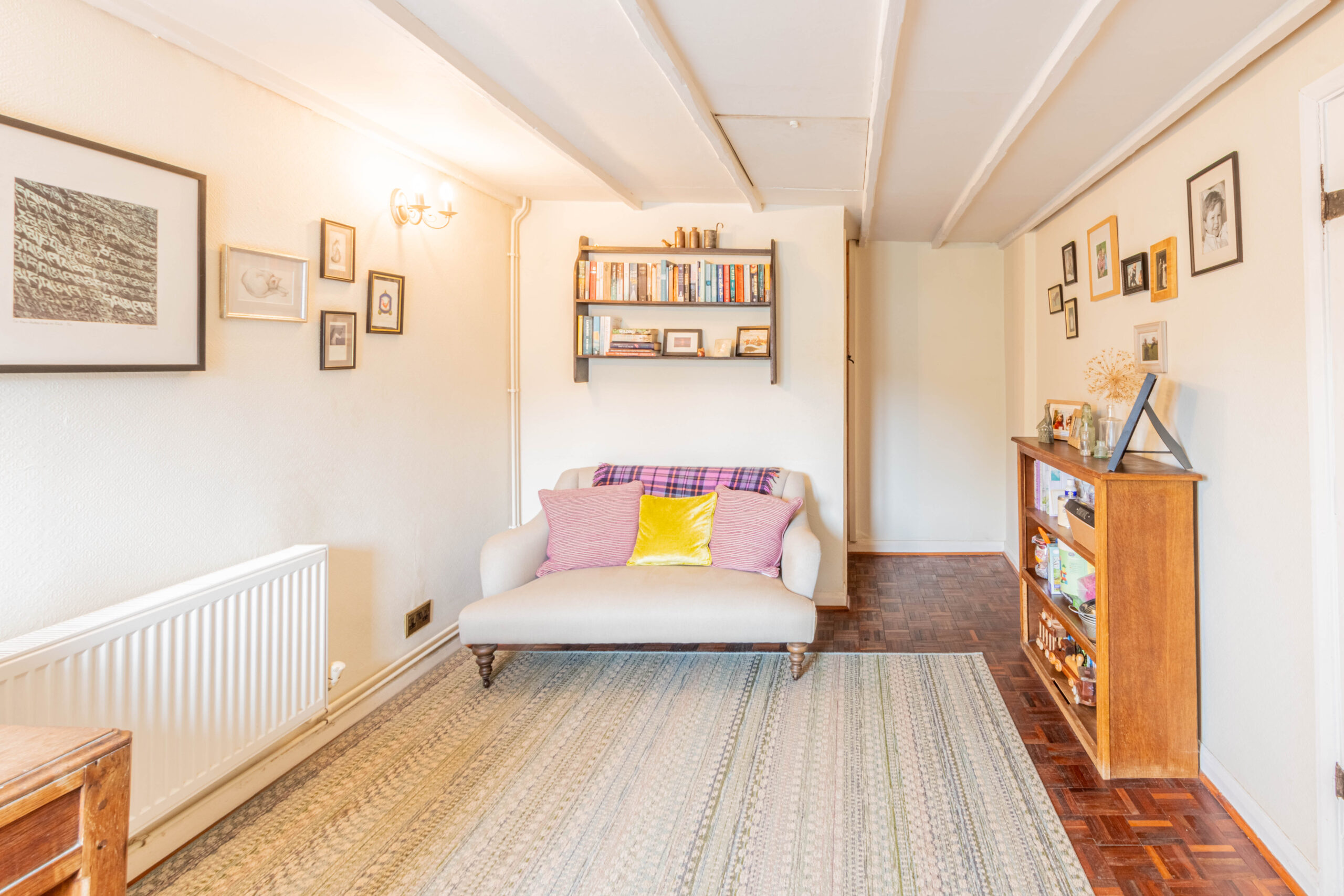 A welcoming sense of warmth and individuality is immediately apparent as you step through the front door. The entrance hall, which also functions as a study space, features original parquet flooring and leads directly to a spacious family bathroom complete with a separate shower enclosure.