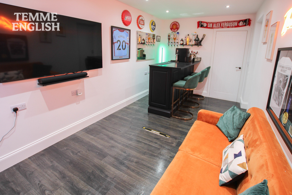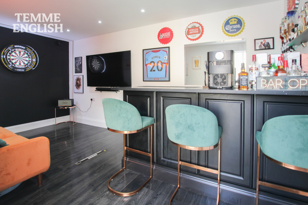 To the rear of the property there is ample private parking via a driveway along with a garage. The garage has been creatively adapted to include a stylish bar area while still retaining useful storage space and its own boarded loft above.